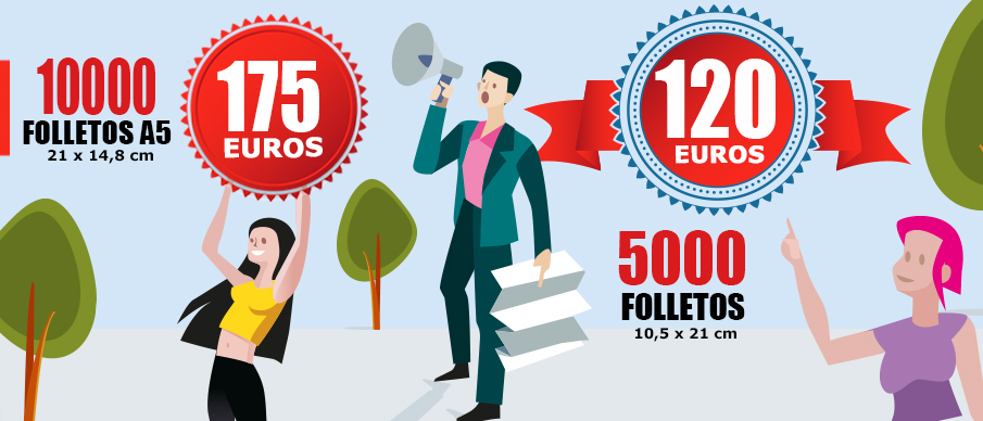 Folletos 14,8x10,5 cms.Impresos a dos caras a todo color y con papel de 115 grs con brillo. Iva y diseño no incluido. -